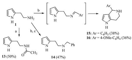 Due to the interesting activity of 1 on hCA I (see results), we decided to synthesize and test a small library of its analogs. Therefore, 2-(1-methyl-1H-pyrrol-2-yl)ethan-1-amine 12 (Table 1) was prepared from commercially available 1-methyl-1H-pyrrole-2-carbaldehyde following the literature procedure [36], whereas the acetyl (13 [37]) and benzyl (14) derivatives were prepared from 1 through standard procedures (Scheme 2). We were also intrigued by the conversion of the primary amino group into a Schiff’s base since this modification confers in some instances isoform selectivity to HST, while generally enhancing the potency [14]. For this reason, p-anisaldehyde was chosen as the reactant together with benzaldehyde for comparison. Thus, 1 was reacted with benzaldehyde in MeOH using 3Å molecular sieves as the dehydrating agent. However, chromatographic separation on Al2O3 afforded only the cyclic derivative 15 as a racemate, probably deriving from a Pictet–Spengler condensation [38]. Similarly, the reaction of 1 with p-anisaldehyde afforded racemic 16. Compound 15 has been previously synthesized by Herz and Tocker [37] from N-benzoyl-2-(2-pyrrole)-ethylamine through a Bischler–Napieralski reaction followed by reduction.