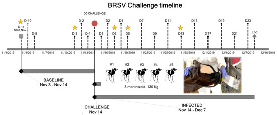 BRSV strain GA-1, P5 was propagated in Madin-Darby bovine kidney cell lines grown in Dulbecco’s minimal essential medium with 10% fetal bovine serum and 2 mM of Gibco™ GlutaMAX™ Supplement. On day 7 post-inoculation of cells, the cell culture supernatant containing −5.20 TCID50 units of BRSV per mL was collected. Then, 5 mL of the supernatant was administered via a nebulizer (DeVilbiss Pulmo-Neb) through a custom-made face mask to each of five non-vaccinated three-month-old Holstein steers weighing approximately 130 kg and housed in outdoor pens isolated from other cattle at Mississippi State University (Animal Care and Use Committee IACUC-19-037) [17]. Clinical signs (VCD) of respiratory infection, including rectal temperature, heart rate, respiratory rate, assessment of nasal and ocular discharge, presence of cough, breathing pattern, and character of lung sounds, were evaluated before and after infection (Figure 1) [17,34].
