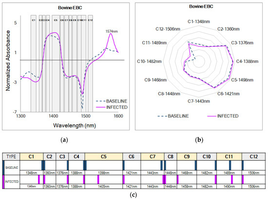 The normalized absorbance of EBC collected in the pre-infection baseline stage and the infected stage when calves had clinical signs of disease revealed different patterns for both categories, indicating differences in the chemical composition of EBC from healthy and sick dairy calves (Figure 3a). Interestingly, at 1574 nm, a prominent feature in the normalized absorbance from the infected stage was unveiled; this wavelength corresponds to the first overtone of N-H stretching vibration and is not included in the current described WAMACS.