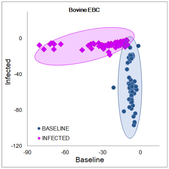 Aquaphotomics was applied to determine the molecular organization of the aqueous phase of EBC as a method to identify the biochemical changes caused by the infection. PCA (principal component analysis) was performed on the mean-centered matrix of the aquaphotomics region (1300–1600 nm) using full random cross-validation and the algorithm SVD (singular value decomposition) as a first step in revealing trends in the spectra with the goal of exploring the data, identifying dominant peaks in the loadings, and looking for outliers (Hotelling’s T2 influence plot) [23]. Previously described WAMACS were used to create barcodes and aquagrams using a spectral database containing samples from all the calves (n = 200) [20,21,23,34]. Using Microsoft Excel 365®, the absorbance was normalized by subtracting the mean transformed absorbance of distilled sterile water as the reference solution from the mean transformed absorbance of each group (baseline or infected) and then dividing the results by the standard deviation (SD) of each category [21,23]. For the barcodes, WABS (water absorbance bands) within the WAMACS were identified by plotting the normalized absorbance to identify the direction of the peaks before detecting the WABS in each point of absorbance of the 12 WAMACS. These identified points were colored in the barcode according to each category to compare chemical shifts [34]. For the aquagram, the identified WABS for the baseline were selected as the points to be plotted in a radar chart to obtain the WASPS (water absorbance spectral patterns), which indicate the trends in the organization of the water molecules of the evaluated samples [21,23].