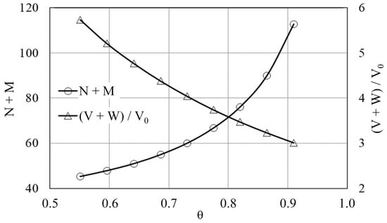 Figure 1 provides the results of calculations using the «KASKAD» original PC software in the form of dependencies of the total number of extraction (N) and scrubbing (M) steps (N + M) and parameter ((W + V)/V0) from relative selection (θ).