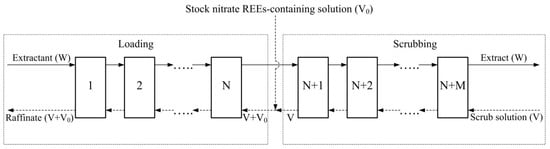 Counter-current extraction cascade operational scheme for separation of REEs to the line La(III)/Pr(III) in nitrate solution containing 258 g La(III)/L, 58 g Pr(III)/L, 141 g Nd(III)/L, and 0.1 mol/L HNO3 using 0.6 mol/L TOMANO3-2.4 mol/L TBP mixture in dodecane. N—18; M—14; O/A (loading)—2/1; O/A (scrubbing)—2.8/1; W—organic phase flow; V—scrub solution flow; V + V0—REE-containing nitrate solution and scrub solution total flow.