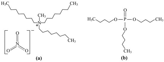 Structure of methyltri-n-octylammonium nitrate (a) and tri-n-butyl phosphate (b).