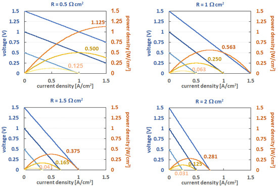 Estimation of the upper power density limits by comparing the ohmic power drop of different OCV (1.5, 1.0, and 0.5 V) with different ASR (0.5, 1.0, 1.5, 2.0 Ω cm2) assuming a constant voltage drop by applying ohmic law. The maximum power densities are highlighted.