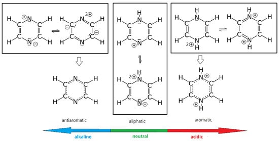 Example of the influence of pH on chemical stability. Tautomeric structures of a non-protonated (alkaline environment), single protonated (neutral environment), and double protonated (acidic environment) pyrazine ring and the related changes of the anti-aromatic, aliphatic, and aromatic state [27] (it should be mentioned that the anti-aromatic nature of unprotonated pyrazines is still under discussion [28]).