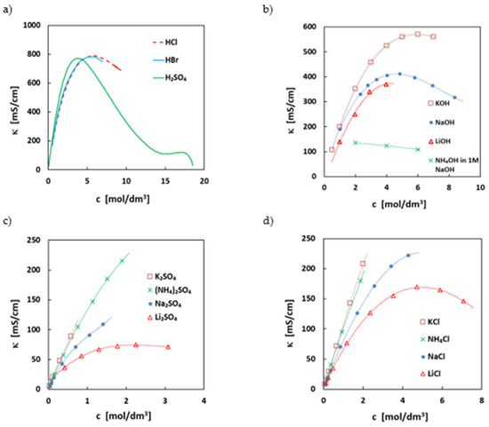 Variation of the specific conductance (κ) with the concentration (c) for some electrolyte solutions used in RFB at 293.15 or 298.15 K. (a) sulfuric acid [40], hydrochloric acid [41], and hydrobromic acid [41]; (b) sodium hydroxide (●) [42], potassium hydroxide (□) [43]; lithium hydroxide (∆) [44], and ammonium hydroxide in 1 mol/L aqueous NaOH (x) [45]; (c) sodium sulfate (●) [46], potassium sulfate (□) [46], lithium sulfate (∆) [47], and ammonium sulfate (x) [46]; (d) sodium chloride (●) [46], potassium chloride (□) [46], lithium chloride (∆) [46], and ammonium chloride (x) [46].