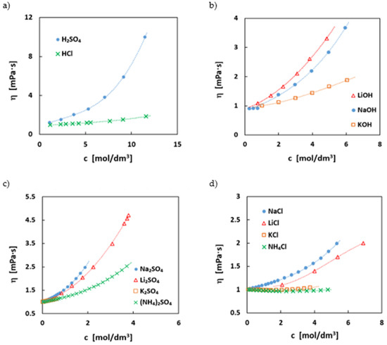 Variation of the viscosity (η) with the concentration (c) for some electrolyte solutions used in RFB at 298.15 K: (a) sulfuric acid (●) [49] and hydrochloride (x) [50]; (b) sodium hydroxide (●) [51]: potassium hydroxide (□) [51] and lithium hydroxide (∆) [51]; (c) sodium sulfate (●) [46], potassium sulfate (□) [46], lithium sulfate (∆) [47], and ammonium sulfate (x) [46]; (d) sodium chloride (●) [46], potassium chloride (□) [46]; lithium chloride (∆) [52], and ammonium chloride (x) [46].