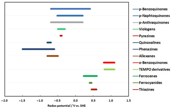 Fortunately, for aqueous organic redox couples, the redox potential of organic redox couples can be tuned by the substituents to the redox moiety. Especially, the redox potential of condensed aromatic heterocycles or quinone-type redox couples can be manipulated by different electron-withdrawing or electron-donating substituents in the condensed aromatic rings. The electron-withdrawing substituents can move the redox potential towards more positive values in the following trend: nitrato > cyanido > perfluormethyl > carboxy > chloride > fluoride (e.g., in phenazines) while electron-donating substituents, such as ethyl < methyl < thiol < hydroxy < ammino < triethylamino, may lower the redox potentials, e.g., in phenazines, if they are substituted at the outer positions of the adjacent aromatic rings [22]. These changes are also valid for quinones but not so pronounced as in the case of phenazines.