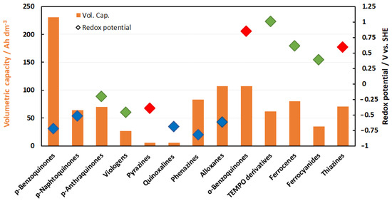 In this review, the authors aim to provide an overview of the current applied redox motives, which are used to develop aqueous organic electrolytes. The other aim of the article is to provide some background for synthetic chemists in which direction they should focus their future work to design molecules, which could be applied in technical electrolytes for flow batteries. In Figure 5, the redox range of most of the reviewed chemistries are given and indicated by a color code, in which pH regime the certain chemistry operates. The first noticeable thing is that more redox couples are located in the negolyte space. This graph also clearly indicates that it is not easy to compile a fully organic redox couple with a voltage higher than 1 V, as you can only potentially combine redox couples from the same pH regime. These two observations illustrate the current situation well, in that in most technical electrolytes, the organic redox couples are usually paired with inorganic posilytes.