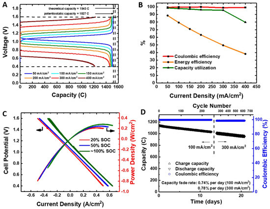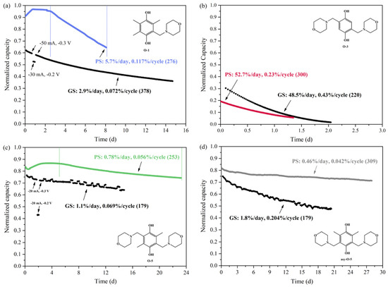 In a recent review, Kwabi et al. compared the stability of five classes of aqueous redox-active organics and organometallics for which cycling lifetime results have been reported: quinones, viologens, aza-aromatics, iron coordination complexes, and nitroxide radicals [29]. The observed capacity fades, categorized from high” (>1%/day) to “extremely low” (≤0.02%/day), were found to be rather time-dominated than cycle-dominated and dependent on the electrolyte state of the charge and the concentration of redox species. Symmetric cell cycling with potential holds was suggested for the evaluation of capacity fades. This experimental approach, which was previously introduced by Goulet et al. [30], provides more accurate results when compared to standard galvanostatic charge-discharge cycling, without the effect of variation in the cell resistance and the permeation of the counter electrolyte.