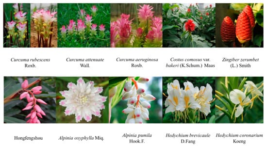 Many of them are considered important horticultural flowers as well as ornamental plants, or used as raw materials for the production of dyes, food, spices, and fragrances []. The stress resistance of Costus comous var. bakeri (K. Schum) Maas is strong, with fresh cut flowers offering a high yield, good quality, and easy cultivation []. The leaves of Alpinia pumila Hook.F. have beautiful stripes, and the fruits are bright red when ripe, and they are highly ornamental []. Curcuma attenuate Wall. is a perennial bulbous herb flower of Curcuma in Zingiberaceae, and is a new multi-purpose flower with ornamental and edible value []. Zingiber zerumbet (L.) Smith is a good garden material and a novel cut flower material, and has ornamental and medicinal value []. The rhizome of Zingiber zerumbet (L.) Smith can dispel wind and detoxify, treat stomachache and diarrhea, and extract aromatic oil as a blending essence. Its tender stems and leaves can be used as vegetables [,]. After screening, excellent lines of ‘Hongfengshou’ in a moderate volume and with abright inflorescence color have been obtained through hybridization, with Alpinia zerumbet (Pers.) Burtt. et Smith being used as the female parent and Alpinia henryi K. Schumann as the male parent []. Alpinia oxyphylla Miq. has the effect of warming the spleen, stopping diarrhea and causing salivation []. Curcuma aeruginosa Roxb. can be used for blood stasis, chest pain, and food retention pain, and may be used against various bacterial and fungal species [,]. Curcuma rubescens Roxb. can promote blood circulation and relieve pain, depression, and the symptoms of hypoxia, as well as clear the heart and cool the blood []. Different extracts of Hedychium coronarium Koeng have significant analgesic and anti-inflammatory properties []. The rhizome of Hedychium brevicaule D. Fang, as a medicinal material, can be used for coughs, phlegm, and asthma []. Pictures of all the mentioned plants are shown in Figure 1.