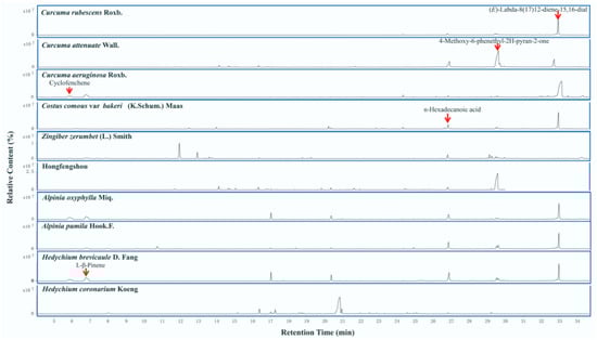 GC–MS TIC of different Zingiberaceae plants. The peaks indicated by the red arrows represent volatiles labeled in the figure. Peaks at the same time indicate the same substance.