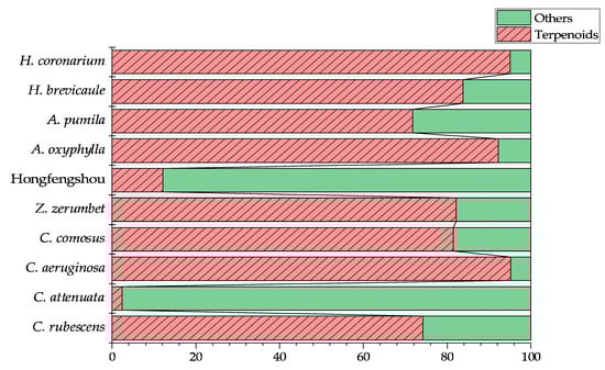 As the most commonly identified compounds were monoterpenes and sesquiterpenes, the proportions terpenoids and others that were detected in the extracts were compared (Figure 5). With the exceptions of C. attenuate and Hongfengshou, terpenoids dominated in these plants. They were found at levels of 95% in C. aeruginosa and H. Coronarium, 92% in A. oxyphylla, 84% in H. brevicaule, 82% in C. comosus and Z. Zerumbet, 74% in C. rubescens, and 72% in A. pumila.