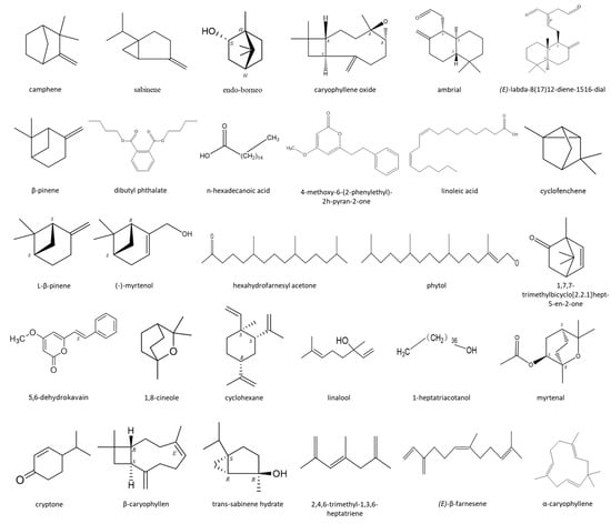 The rhizome of C. aeruginosa has been used as a traditional medicine for gastrointestinal issues such as diarrhea and colic, as well as for uterine involution, uterine pain, and inflammation []. C. attenuata has shown medicinal value, and most Curcuma species have been used as good natural anti-oxidants in functional foods, medicines, and cosmetics [,]. Modern pharmacological studies have shown that the fruit of A. oxyphylla has many biological activities, such as regulating urination, improving cognitive ability, improving diabetes, and as an anti-bacterial and anti-tumor treatments []. Z. zerumbet can be used to treat inflammation, fever, toothache, diarrhea, pain, muscles spasms, and rheumatisms []. A. pumila has been widely used in the treatment of traumatic injury as a folk medicine []. According to reports, all the ten Zingiberaceae plants have both medicinal and ornamental value [,,,,,,,,,,,,]. They are rich in terpenoids, and the structures of their main volatile chemicals are shown in Figure 6. Most of the Zingiberaceae plants are medicinal plants which have unique therapeutic capacities and the ability to treat various human diseases [,,]. The differences in the contents and compositions of their volatile components leads to differences in aroma and medicinal value among different plants [].