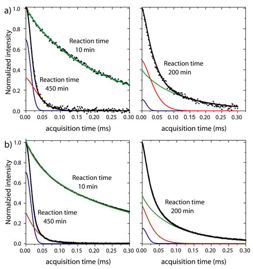 Figure 2b), the slow decaying fraction of the signal decreases while the fast-decaying fraction increase. When the reaction finishes (reaction time of 450 min in