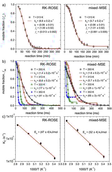 Figure 3), but have their mobility increased at 313 K. This remaining mobile component is more evident in the mixed-MSE data due to its ability of refocusing field inhomogeneity effects. We shall consider that even though these segments can contribute to a significant fraction of the signal, they do not hinder the analysis of the reaction kinetics, as they remain constant after the reaction is completed.