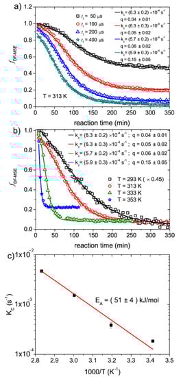 Therefore, for a filter time adjusted such as , the fraction has the same behavior of concerning the dependence with the reaction time. Thus, it can also be fitted using Equation (3) to obtain the reaction kinetic parameters.