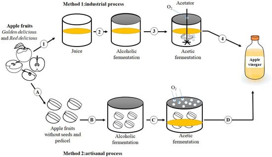 Industrial and artisanal procedures to produce apple vinegar. 1: apple juice extraction; 2: alcoholic fermentation; 3: acetic fermentation; 4: production of vinegar via the industrial method; A: usage of apple fruits without seeds and pedicel; B: alcoholic fermentation; C: acetic fermentation; D: production of vinegar via the artisanal method.