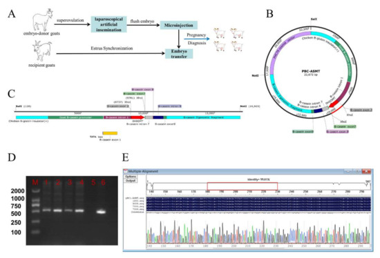The procedure to generate ASMT-overexpressed goats. (A)The process used to design prokaryotic embryo microinjection; (B) pBC1-ASMT vector; (C) micro-injection vector of ASMT; (D) PCR identification of transgenic offspring (M: marker, 1:1602, 2:5006, 3:7004, 4:7006, 5: control, 6: pBC1-ASMT); (E) sequence alignment of transgenic offspring.
