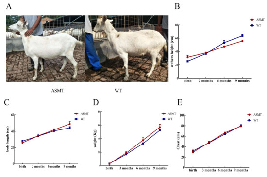 The general phenotype of ASMT-overexpressed goats compared to the WT goats. (A) Photos of ASMT-overexpressed and WT goats; (B) the body height; (C) the body length; (D) The body weight; (E) the breast size. Note: the transgenic goat (n = 3), wild type (n = 3).