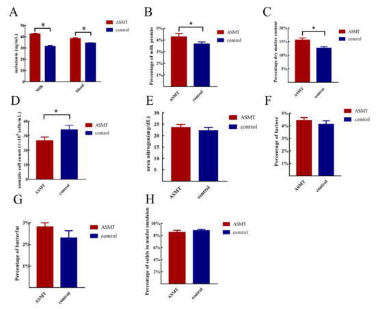 Comparisons of the melatonin levels in blood and milk as well as the milk parameters between transgenic (ASMT) and WT goats. (A) Melatonin levels in the blood and milk; (B) protein content in milk; (C) dry matter content in milk; (D) somatic cell count in milk; (E) urea nitrogen in milk; (F) lactose content in milk; (G) fat in milk; (H) non-lipid solids in milk. Note: the transgenic goat (n = 3), wild type (n = 3), * represents significant differences between the two groups.