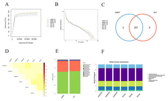 Gut microbiota distributions in transgenic (ASMT) and WT goats. (A) Dilution curve; (B) rank–abundance curve; (C) Venn diagrams; (D) distance matrix heat map; (E) histogram of distribution of species at the level of order; (F) heat map of KEGG Function Classification at the order level. Note: the transgenic goat (n = 3), wild type (n = 3).