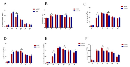 The effects of E. coli injection on the biophysiological indexes in transgenic (ASMT) and WT goats. (A) C-reactive protein content; (B) globulin content; (C) white blood cell content; (D) lymphocyte content; (E) neutrophil content; (F) content of monocyte macrophages. * represents significant differences between the two groups.
