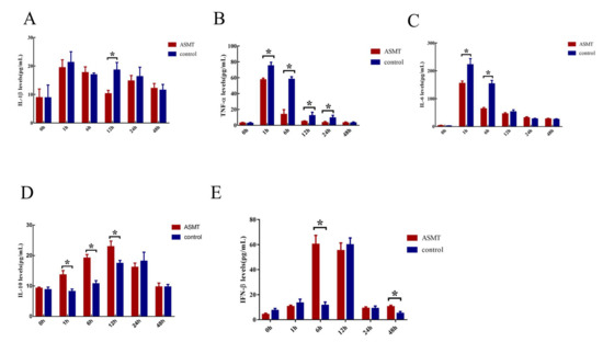 The effects of E. coli injection on inflammatory cytokines in transgenic (ASMT) and WT goats. (A) IL-1β; (B) TNF-α; (C) IL-6; (D) IL-10; (E) IFN-β. Note: the transgenic goat (n = 3), wild type (n = 3), * represents significant differences between the two groups.