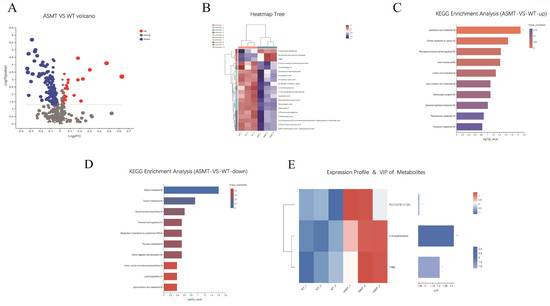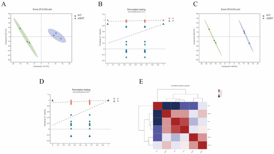After E. coli injection, the Partial Least Squares Discriminant Analysis (PLS-DA) method was used to analyze the serum metabolomic alterations. The confidence level of the PLS-DA data was above 95%, and different groups were in different ellipses. For the analysis of the positive ions, two principal component analysis groups were obtained (Figure 7A). The cumulative interpretation rate R2X (cum) and R2Y (cum) of the PLS-DA model for principal component 1 were 31.6% and 95.2%, respectively, and the cross-validation predictive power of the model was 66.1% (q2 cum). The cumulative interpretation rates of principal component 2 (R2X) and R2Y (cum) were 31.4% and 99.1%, respectively, and the cross-validation predictive power of the model was 58.6% (Q2 cum). With the decrease in replacement retention, R2 and Q2 decreased, and the regression line showed an upward trend, which indicated that the prediction model was reliable (Figure 7B). The analytic results of the anions were similar to cations (Figure 7C,D). The cationic and anion data showed significant differences, indicating that there was a significant difference in the serum metabolome between the ASMT-overexpressed dairy goats and the WT goats (p < 0.05). Heat map analysis also showed significant differences in the metabolic composition and abundance between the groups (p < 0.05) (Figure 7E).