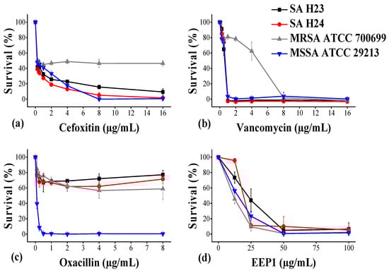 Inhibitory effect of antibiotic drugs: (a) Cefoxitin (0.25–16 µg/mL); (b) Vancomycin (0.25–16 µg/mL); (c) Oxacillin (0.125–8 µg/mL); and (d) EEP1 (12.5–100 µg/mL) on S. aureus; clinical isolates (SA H23 and SA H24), and reference strains methicillin-susceptible S. aureus ATCC 29213 (MSSA) and methicillin-resistant S. aureus ATCC 700699 (MRSA).