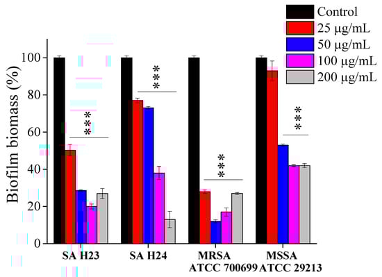 It is considered that biofilms contribute to more than 80% of all infections in humans. The formation of biofilms by MRSA and MSSA strains is an important virulence factor, affecting its persistence in both the environment and the host organism, as bacterial cells in biofilms show increased resistance against conventional antimicrobial treatments and host immune factors [65]. It is cumbersome to remove the mature biofilms and reduce the growth of dormant bacteria inside biofilm matrix, due to the difficulty of drug penetration into the biofilm. It has been well characterized that bacteria in biofilms can tolerate up to 10–1000 times higher concentrations of antibiotics than planktonic bacteria [9]. In this assay the cultures of S. aureus were grown for 24 h at 37 °C, then the formed biofilm was treated with various EEP1 concentrations for 16 h, and the biofilm eradication was detected by crystal violet colorimetric assay. The MBEC50 was defined previously as the concentration that causes a 50% reduction in the biofilm metabolic activity [69]. The EEP1 significantly enhanced the biofilm degradation in each strain and showed MBEC50 values of 15, 18, 48, and 52 µg/mL against MRSA ATCC 700699, SA H23, SA H24, and MSSA ATCC 29213, respectively. The biofilm of MSSA and SA H24 strains showed more resistance to the EEP1; however, the thickness of biofilms was degraded at 200 µg/mL of EEP1 by 47% and 87%, respectively. The most sensitive biofilm was observed in the case of MRSA ATCC 700699 and SA H23 strains, where the degradations of the 24 h-old biofilms were 88% and 71%, respectively, after treatment with 50 µg/mL of EEP1. In contrast, unexpected growth of the biofilm biomass of the same strains was observed in the presence of high EEP1 concentration (200 µg/mL) (Figure 3). Such a similar result was reported in the biofilm of S. epidermidis, it was further suggested that the efficiency of propolis can be reduced over time. In addition, after 24 h the propolis stimulates biofilm formation and added that the high concentration of EEP could be used as a nutrient by bacteria for its proliferation [66].