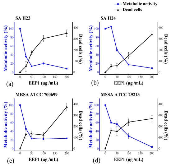 The effect of EEP1 (25–200 µg/mL) on 24 h-old biofilms formed by: (a) Clinical isolates of S. aureus SA H23, (b) SA H24, (c) S. aureus ATCC 700699 (MRSA), and (d) S. aureus ATCC 29213 (MSSA), after 16 h incubation via the determination of metabolic activity of the cells that is in proportion to the resazurin fluorescent reaction (blue lines) and dead cells that is proportional to the fluorescence of propidium iodide (black lines) within the mature biofilms.