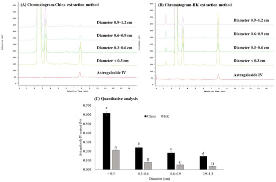 Effects of different diameters on the content of Astragaloside IV in Astragali radix (AR). HPLC chromatogram of standard solution (Astragaloside IV) and test solution (AR with different diameter sizes) based on the China (A) and HK (B) extraction method. (C) Quantitative analysis of Astragaloside IV content with different diameter sizes. Data are expressed as mean ± SD from three separate experiments; means not sharing an alphabetic letter (lowercase for China and uppercase for HK) differs statistically (p < 0.05). Abbreviations (alphabetically): China, the Pharmacopoeia of China; HK, the Hong Kong Chinese Materia Medica Standards.