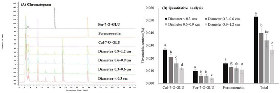 Effects of different diameters on the content of flavonoids in Astragali radix (AR). (A) HPLC chromatogram of standard solution (individual flavonoid) and test solution (different diameter sizes). (B) Quantitative analysis of flavonoids content with different diameter sizes. Data are expressed as mean ± SD from three separate experiments; means not sharing an alphabetic letter (lowercase for Cal-7-O-GLU, uppercase for For-7-O-GLU, italic lowercase for formononetin, and italic uppercase for total flavonoids) differ statistically (p < 0.05). Total flavonoids is the sum of Cal-7-O-GLU, For-7-O-GLU, and formononetin. Abbreviations (alphabetically): Cal-7-O-GLU, Calycosin-7-O-β-d-glucopyranoside; For-7-O-GLU, Formononetin-7-O-glucoside.
