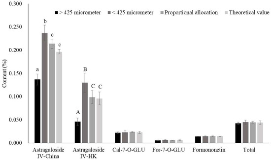 Effects of powder particle size on the content of Astragaloside IV and flavonoids in Astragali radix with a diameter of 0.3–0.6 cm. Data are expressed as mean ± SD from three separate experiments; means not sharing an alphabetic letter (lowercase for China and uppercase for HK) differs statistically (p < 0.05). Total flavonoids is the sum of Cal-7-O-GLU, For-7-O-GLU, and formononetin. Abbreviations (alphabetically): Cal-7-O-GLU, Calycosin-7-O-β-d-glucopyranoside; China, the Pharmacopoeia of China; For-7-O-GLU, Formononetin-7-O-glucoside; HK, the Hong Kong Chinese Materia Medica Standards.