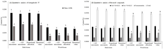 Effects of bark- and wood-tissue with diverse powder particle size on the content of Astragaloside IV (A) and flavonoids (B) in Astragali radix. Data are expressed as mean ± SD from three separate experiments; means not sharing an alphabetic letter (left panel: lowercase for China and uppercase for HK; right panel: lowercase for formononetin and uppercase for total flavonoids) differ statistically (p < 0.05). Total flavonoids is the sum of Cal-7-O-GLU, For-7-O-GLU, and formononetin. Abbreviations (alphabetically): Cal-7-O-GLU, Calycosin-7-O-β-d-glucopyranoside; China, the Pharmacopoeia of China; For-7-O-GLU, Formononetin-7-O-glucoside; HK, the Hong Kong Chinese Materia Medica Standards.