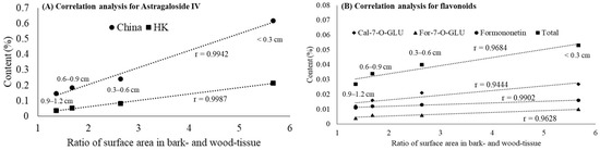 Correlation analysis between the active component content (Astragaloside IV and flavonoids) and the ratio of surface area in bark- and wood-tissue surface area in Astragali radix with different diameters. The surface area of bark and wood-tissue was calculated by Image J software and the surface area of bark was computed by subtracting wood-tissue from the total area. The ratio of surface area in bark and wood-tissue was calculated as bark area divided by wood-tissue area. Total flavonoids is the sum of Cal-7-O-GLU, For-7-O-GLU, and formononetin. Abbreviations (alphabetically): Cal-7-O-GLU, Calycosin-7-O-β-d-glucopyranoside; China, the Pharmacopoeia of China; For-7-O-GLU, Formononetin-7-O-glucoside; HK, the Hong Kong Chinese Materia Medica Standards.