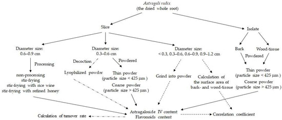 AR samples were collected from Gansu province, China, and the source was identified as the dried root of Astragalus membranaceus (Fisch.) Bge. var. mongholicus (Bge.) Hsiao (Fam. Leguminosae) by our certificated testing center. The voucher specimen was stored properly. The overall preparation of diverse test specimens was summarized in Figure 7. In our routine analysis of active ingredients’ content in Chinese herbal medicine, the test specimens were powdered and sieved by a 40-mesh sifting screen with an aperture of 425 μm. For the preparation of different diameter sizes of samples powder, the whole root was sliced into diameter sizes of <0.3, 0.3–0.6, 0.6–0.9, and 0.9–1.2 cm based on the cross-section size. All sliced samples were powdered and sieved. During the grinding process, around 20% (w/w) of the whole root sample cannot pass through the 40-mesh sieve due to its fibrous property. The powdered samples, also called proportional allocation samples, were made according to the ratio of thin powder (particle size < 425 μm) and coarse powder (particle size > 425 μm). For the preparation of different powder particle sizes, the diameter size of 0.3–0.6 cm of sliced specimens was selected, powdered, sieved, and divided into three subdivisions, which were coarse powder, thin powder, and proportional allocation.