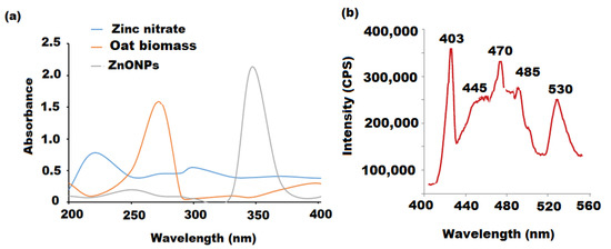 (a) UV-Vis spectra of green synthesized ZnONPs using oat biomass. The recorded spectra screened in the wavelength range 200–400 nm. (b) Photoluminescence spectrum of green synthesized ZnONPs using oat biomass.