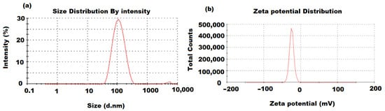 A dynamic light-scattering analysis was employed to calculate the distribution and average particle size of the green synthesized ZnONPs. The obtained ZnONP particle size was approximately around 100 nm (Figure 2a). A further analysis (zeta potential) was performed to determine the constancy and surface charge of the pre-formed ZnONPs. The recorded results indicate that the moderate stability of the formed ZnONPs resulted from the negatively charged groups of the capping molecules present on the ZnONPs’ surface. The evaluation of the zeta-potential depends on the motion of ZnONPs under the effect of the applied electric field. The determined average value of zeta-potential resulting from the ZnONP analysis was −27.6 mV, revealing the high stability of the prepared ZnONPs (Figure 2b).