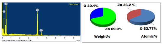 An EDX detection was applied to quantify the chemical compositions of the biogenic synthesized ZnONPs using oat biomass. The EDX spectrum showed significant signals corresponding to the Zn (weight%, 69.9%; atomic %, 36.2%) and O (weight%, 30.1%; atomic % 63.77%) elements, revealing the formation of ZnONPs (Figure 4). The results revealed the presence of metallic zinc oxide with high purity and no additional peaks corresponding to other elements were recorded.