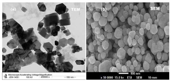 (a) TEM and (b) SEM images of ZnONPs synthesized using oat biomass.