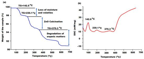 The thermal behavior of the biosynthesized ZnONPs using oat biomass extract was investigated through the TGA/DSC mode. As the synthesis of ZnONPs was carried out at 80 °C, the effect of temperature variation on the stability of the formed metal oxide nanoparticles was examined [50]. Figure 6a displays the thermogram behavior of ZnONPs in the temperature range 80–700 °C. The obtained results show that the nominal overall loss of biosynthesized ZnONPs was around 9.5% indicating the significant thermal stability of the sample. Moreover, it was reported that the zinc nitrate precursor that had been used in the synthesis process was completely converted to thermal stable ZnONPs [51]. The thermogram displayed three remarkable regions of weight losses and diffraction scanning calorimetry (DSC) was applied to interpret these regions (Figure 6b).