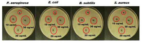 The antibacterial effect of green synthesized ZnONPs with oat biomass was studied and the outcomes confirm that ZnONPs exhibited excellent dose-dependent manner antibacterial potential (Table 1). The calculated inhibition zones were found as E. coli (16 mm), P. aeruginosa (17 mm), S. aureus (12 mm) and B. subtilis (11 mm) for ZnONPs (Figure 7). Thus, the recorded results reveal that the ZnONPs synthesized by oat biomass showed excellent antibacterial potential against all bacterial strains. The highest activity was noticed versus P. aeruginosa and E. coli using 30 µg mL−1. Moreover, the high antibacterial behavior of ZnONPs (oat biomass) could be ascribed to their minimum particle size and shape, and the bioactive feature of oat phytochemical components such as vitamin E, sterols, phytic acid, carotenoids, β-glucan and phenolics [59].