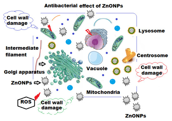 MBC is known as the least concentration of test sample compound that can lead to pathogenic cell death under a particular condition through a fixed time period (Figure 8a,b). The MBC for P. aeruginosa and E. coli were 160 and 320 μg mL−1 of ZnONPs, respectively (Table 2). Based on the unique physical and chemical properties of ZnONPs, different possible mechanisms of their antibacterial effects have been suggested, with specific interactions such as adsorption, release of Zn2+ ions, generation of reactive oxidative species (ROS) [63,64] and intercellular responses of microbial cells, such as lipid peroxidation, cell membrane damage, energy metabolism inhibition and disruption in DNA replication [65,66]. As can be seen from Figure 9, it was demonstrated that the positively charged ZnONPs interacted with the negatively charged cell wall of bacterial cells and, after adsorption, they internalized into the bacterial cell causing loss of cell integrity, rupture of the cell membrane and further oxidative stress due to lipid peroxidation leading to generation of ROS, damage of DNA and inhibition of the bacterial growth.