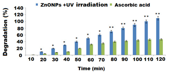 The photocatalytic effect of ZnONPs calculated as % of RB dye degradation in the presence of UV irradiation with respect to ascorbic acid as control. * and **, p < 0.05.