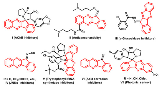 Indeno[1,2-b]quinoxaline skeleton compounds exist in a wide number of drug candidates [1,2,3,4,5,6,7]. They exhibit diverse biological properties, such as acetylcholinesterase (AChE) inhibitory activity (I) [1], antitumor activity (II) [2,3], α-glucosidase inhibition (III) [4], c-Jun N-terminal kinase (JNK) inhibition (IV) [5,6], and tryptophan-tRNA synthase (TrpRS) inhibition (V) [7]. Furthermore, functionally substituted indeno[2,3-b]quinoxalines show potential as acid corrosion inhibitors for mild steel surfaces (VI) [8] and can be used as a photonic sensor to detect fluorescent dyes in the waste effluents of textiles, paper, dyes, and other industrial products (VII) [9] (Figure 1).