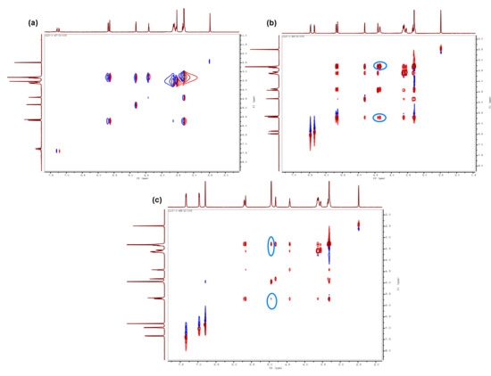 The 2D NOESY NMR spectra of freeze-dried: (a) 2-indanone (1.0 eqv.) and β-CD (15 mol%), (b) o-phenylenediamine (1.2 eqv.) and β-CD (15 mol%), and (c) 2,3-diaminonaphthalene (1.2 eqv.) and β-CD (15 mol%). Mixed after stirring in water for 12 h.