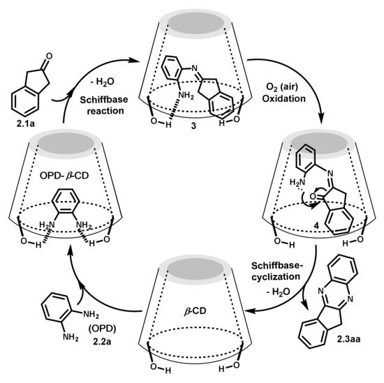 After determining the optimal conditions, we extended the process to other substrates. The results are shown in Figure 2. We observed that the substitution groups on OPD decreased the product yield significantly, while the substituents on 2-indanone had relatively little effect on the yield. For example, the product (2.3ad-1 and 2.3ad-2) yield was only 54% when the OPD was substituted in 4-Cl. However, the product (2.3ba-1 and 2.3ba-2) yield was 80% when the chlorine substitution occurred on the benzene ring of 2-indanone. The substitutions of the electron donor groups and of the electron withdrawing groups on the OPD both led to a decrease in product yield. A double substitution caused a greater reduction in the yield than a single substitution. It is interesting that 2,3-diaminonaphthalene reacted with 2-indanone better than the OPD. The yield of the corresponding product (2.3aj) was 89%. It is known that the inclusion constant of naphthalene and β-CD is greater than that of benzene and its derivatives [25,26,27]. Therefore, it is supposed that the complexation of β-CD and OPD and its derivatives played a key role in the catalysis.