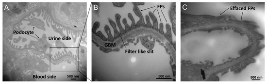 Transmitted microscopy images of the slit membrane structure. (A) A transmitted electron microscopy image of the mouse glomerulus. (B) A zoomed-in image of the slit membrane structure. (C) A collapsed slit membrane structure in streptozocin (STZ)-induced diabetic mice glomerulus.